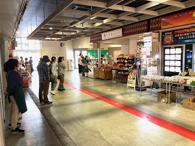 を、のうれんプラザ1階にあるせんべい屋さんの前に、のうれんプラザの皆さん商売はそっちのけで